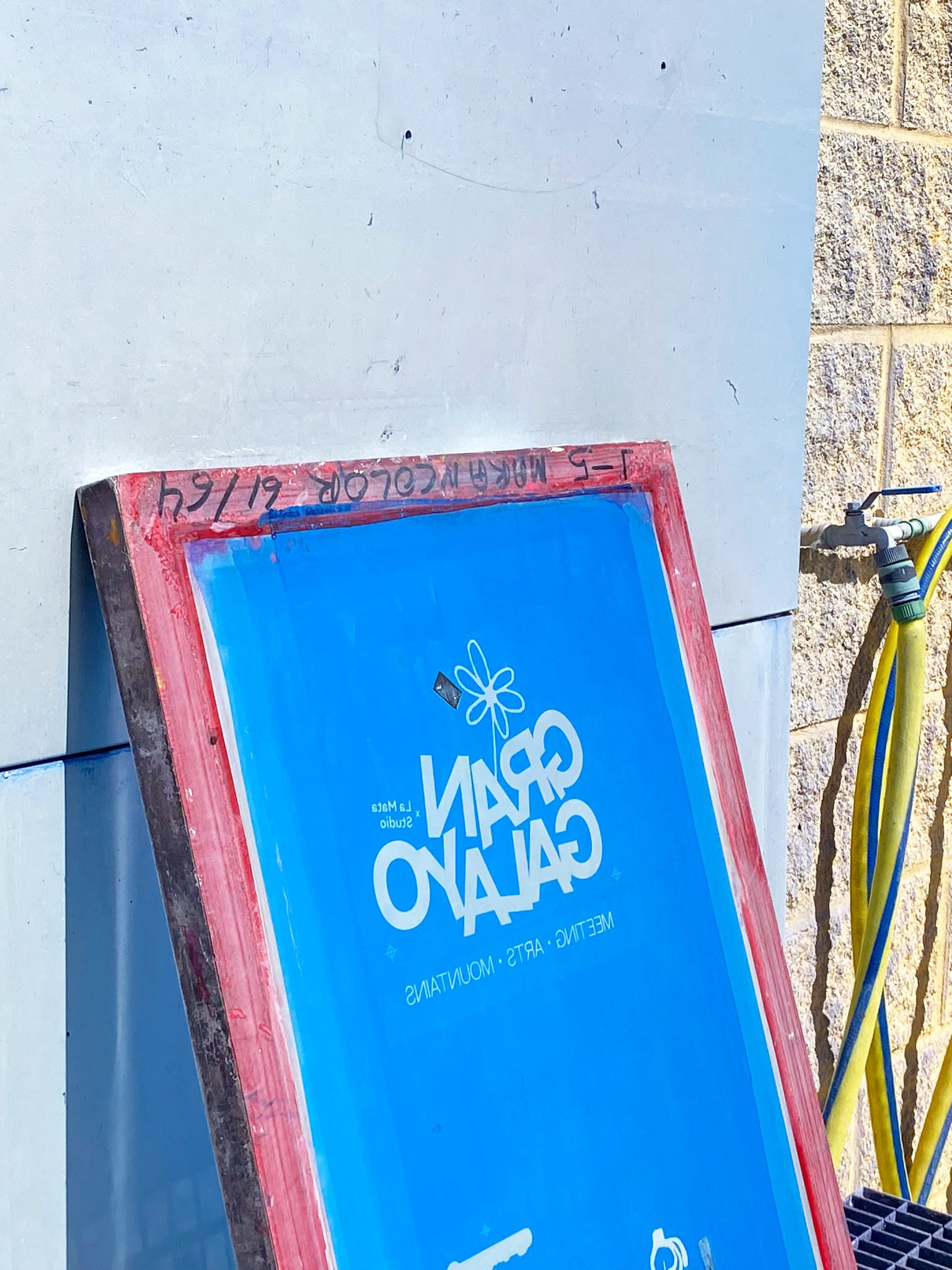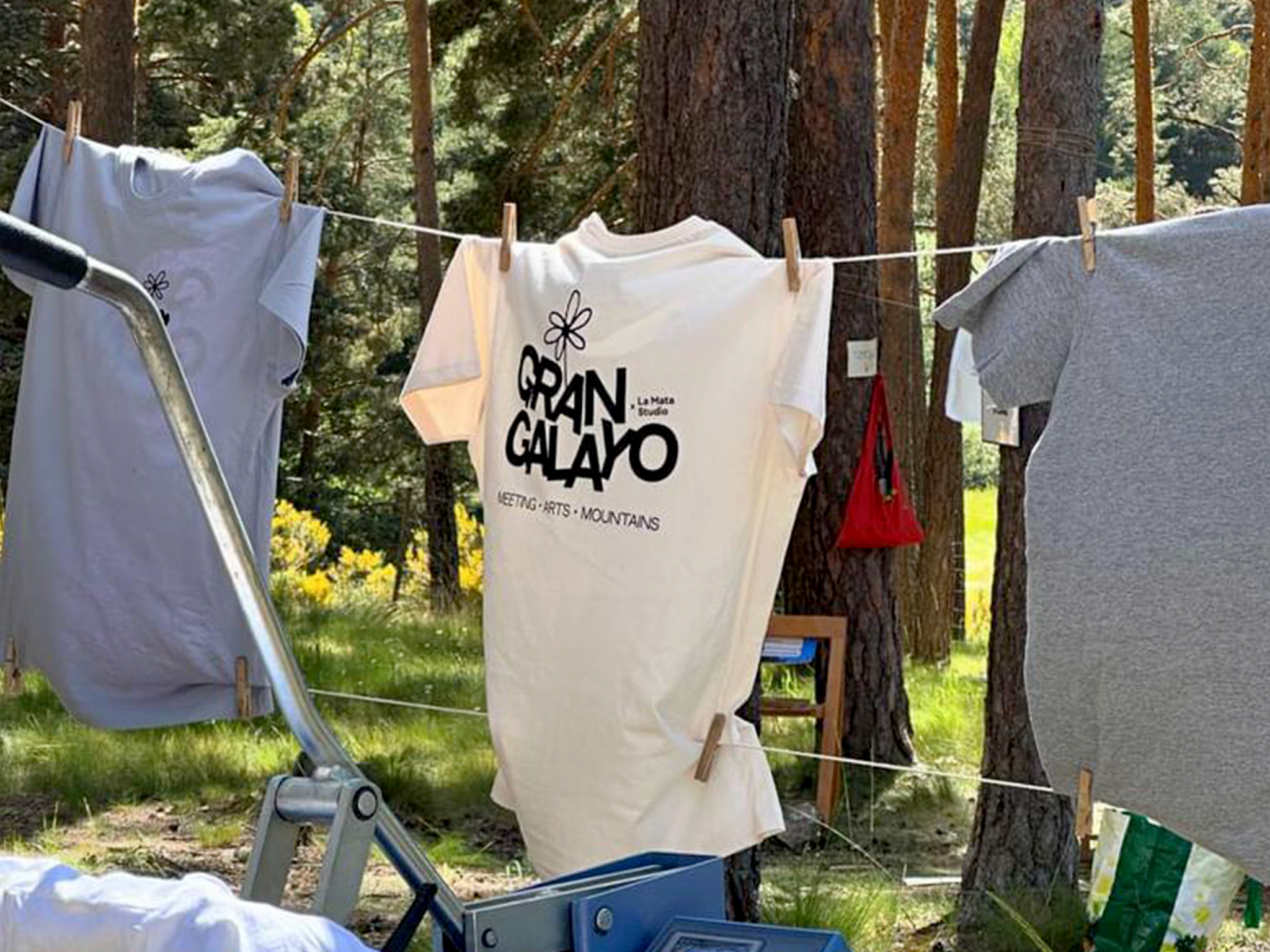 La intención del taller fue acercar la producción en serigrafía a los participantes. Contábamos cómo funciona todo un proceso para imprimir esas camisetas en serigrafía, desde el fotolito hasta la pantalla ya lista para imprimir. Después cada uno agarraba la rasqueta e imprimía su propia camiseta. El resultado fueron 5 horas de serigrafía en mitad el monte, rodeados de personas, manos curiosas y mucho polen.